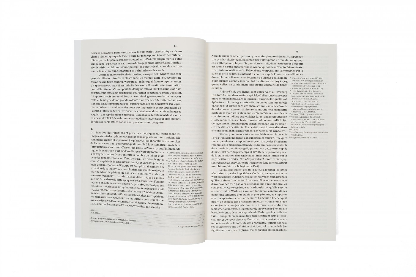 Cette édition des Fragments est accompagnée de la traduction d’une courte autobiographie intellectuelle que Warburg a rédigée en 1927 (« De l’Arsenal au Laboratoire »).