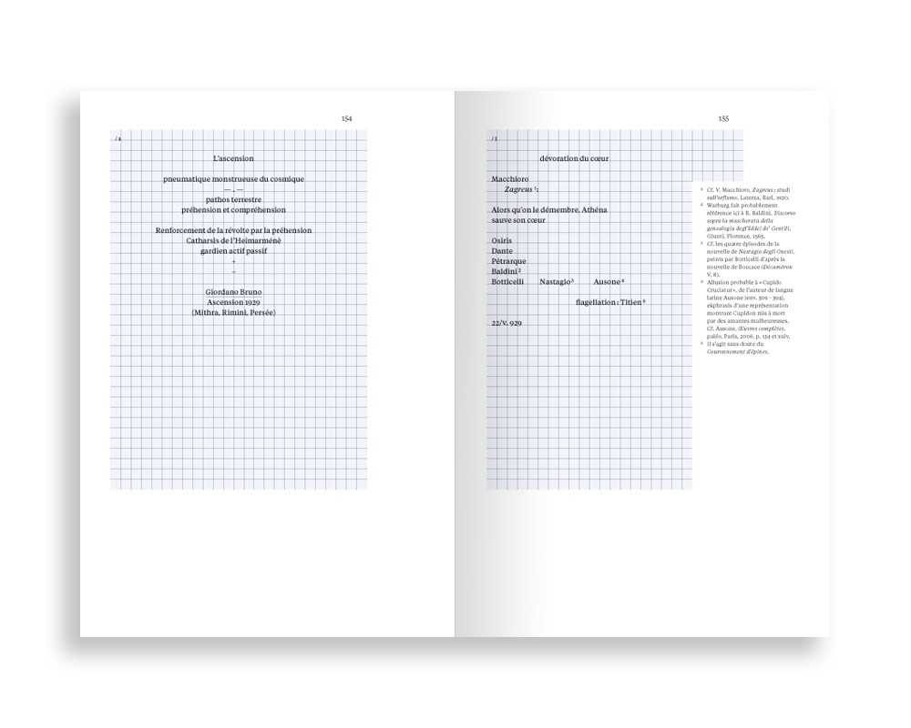 À travers la figure de Giordano Bruno et la lecture du Déjeuner sur l’herbe de Manet, Aby Warburg, le grand spécialiste de l’art de la Renaissance, nous invite à quitter les chemins balisés de l’histoire de l’art. Reprenant la question de la migration des symboles, sur laquelle il s’était longuement penché en étudiant l’héritage et les survivances de l’Antiquité, Warburg s’intéresse désormais au nouvel espace de pensée que l’homme a conquis avec la naissance de la science moderne. C’est à Rome, dans cette ville qui a gardé visibles toutes les couches de son passé et où affleurent toutes les traces de la culture visuelle européenne, que Warburg va nourrir ses ultimes réflexions et les jeter, éparses, sur le papier. Journal de pensée, laboratoire d’écriture, ce volume présente une coupe – un écorché – des deux dernières années de la vie de Warburg. Entre les lignes d’un carnet de voyage rédigé à quatre mains avec Gertrud Bing, c’est aussi tout le grand projet de l’Atlas Mnémosyne que l’on voit ici prendre forme.
